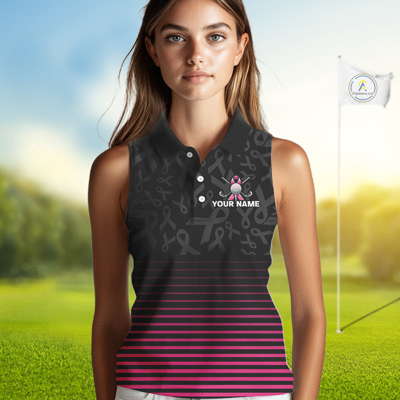 Pink and black Ribbons Pattern Sleeveless polo Shirt Custom Breast cancer awareness Team Golf attire NQS10559