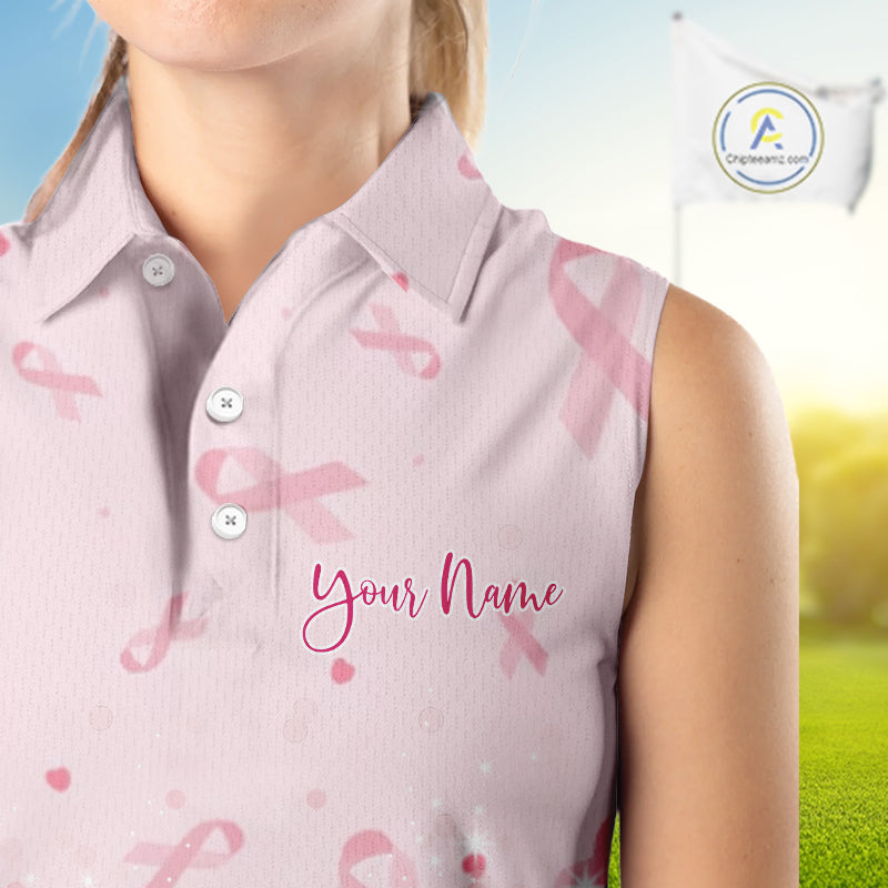 Pink glitter ribbons pattern Sleeveless polo shirt Custom Breast Cancer Awareness ladies golf outfit NQS10514