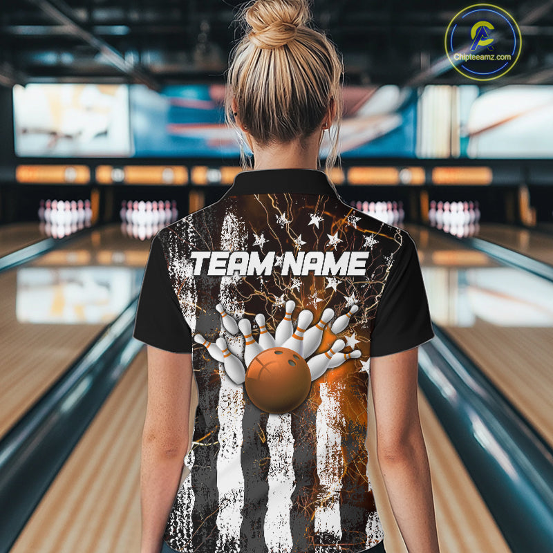 Orange Lightning US Flag Custom Bowling Jersey, Patriotic Bowling Women Quarter-Zip Shirt IPHW9917