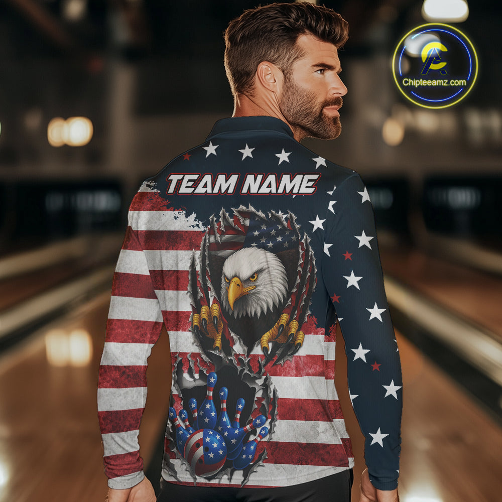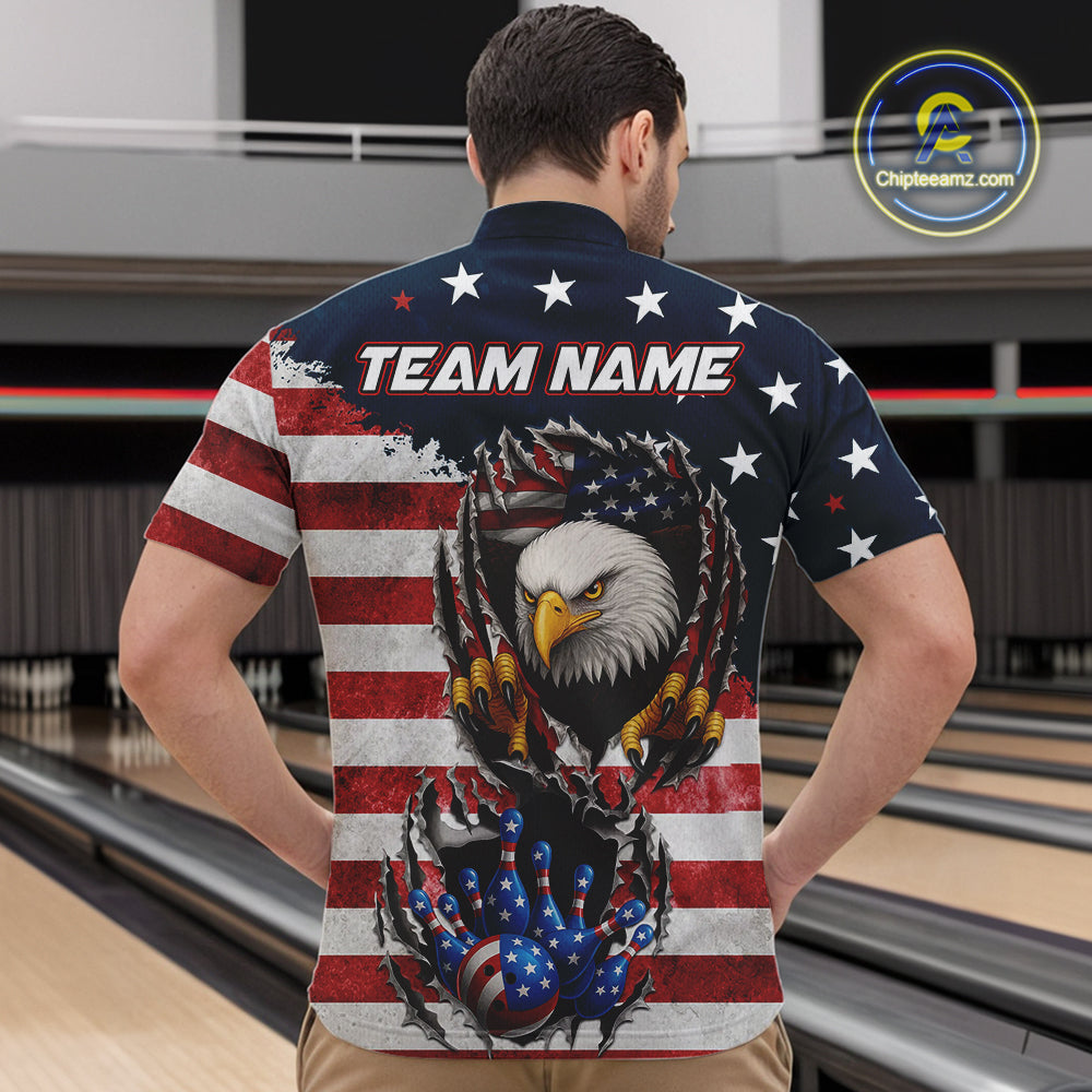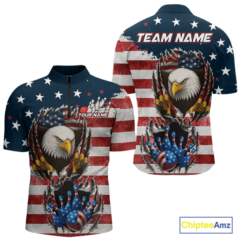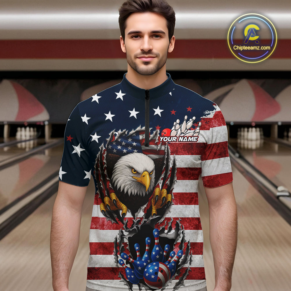 Vintage American Flag Eagle Bowling Polo, 1/4 Zip Shirt for Men Custom Patriotic Team Bowling Jersey NQS10569