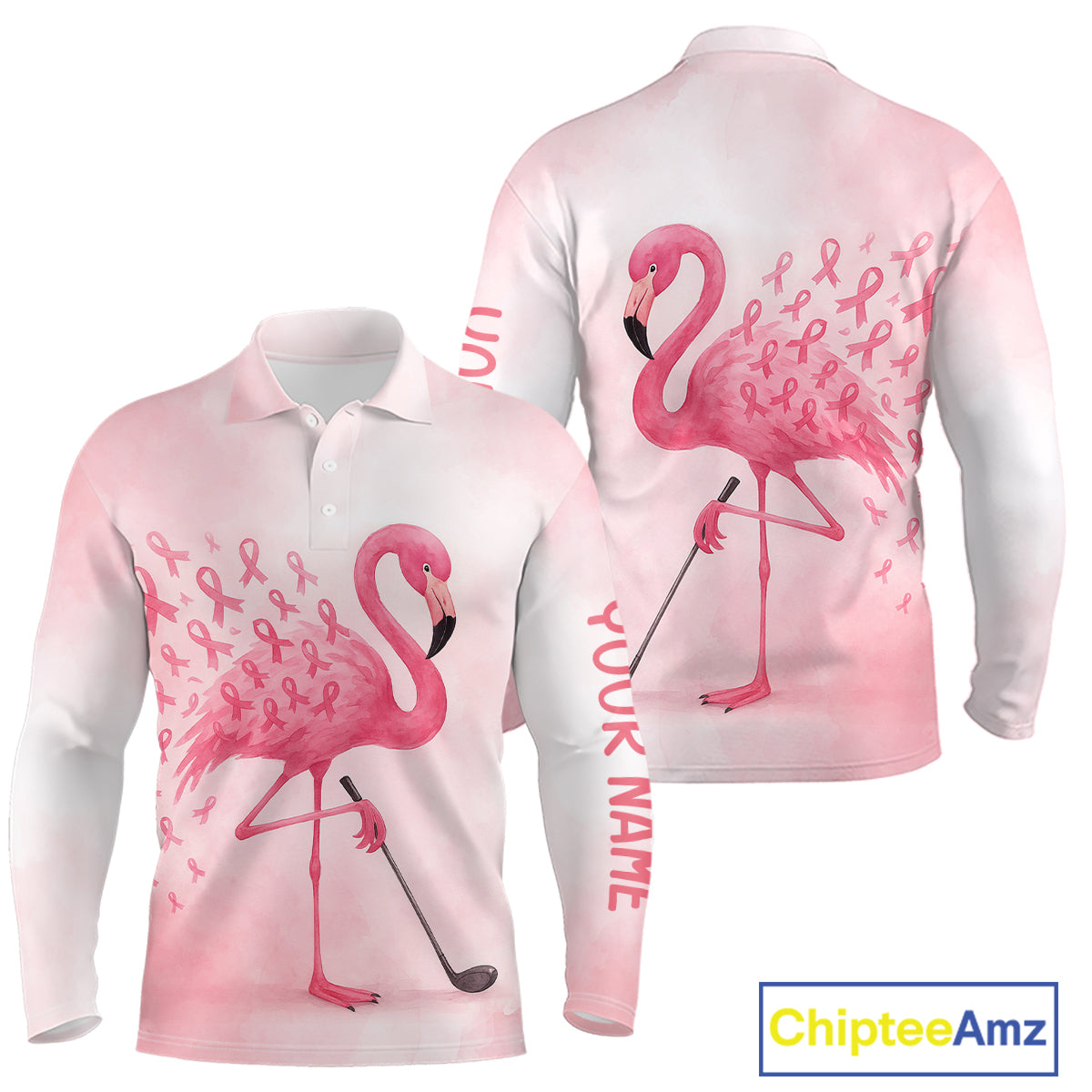 Watercolor Pink Flamingo ribbons Mens golf polo shirts Custom Breast Cancer Awareness men golf attire NQS10512