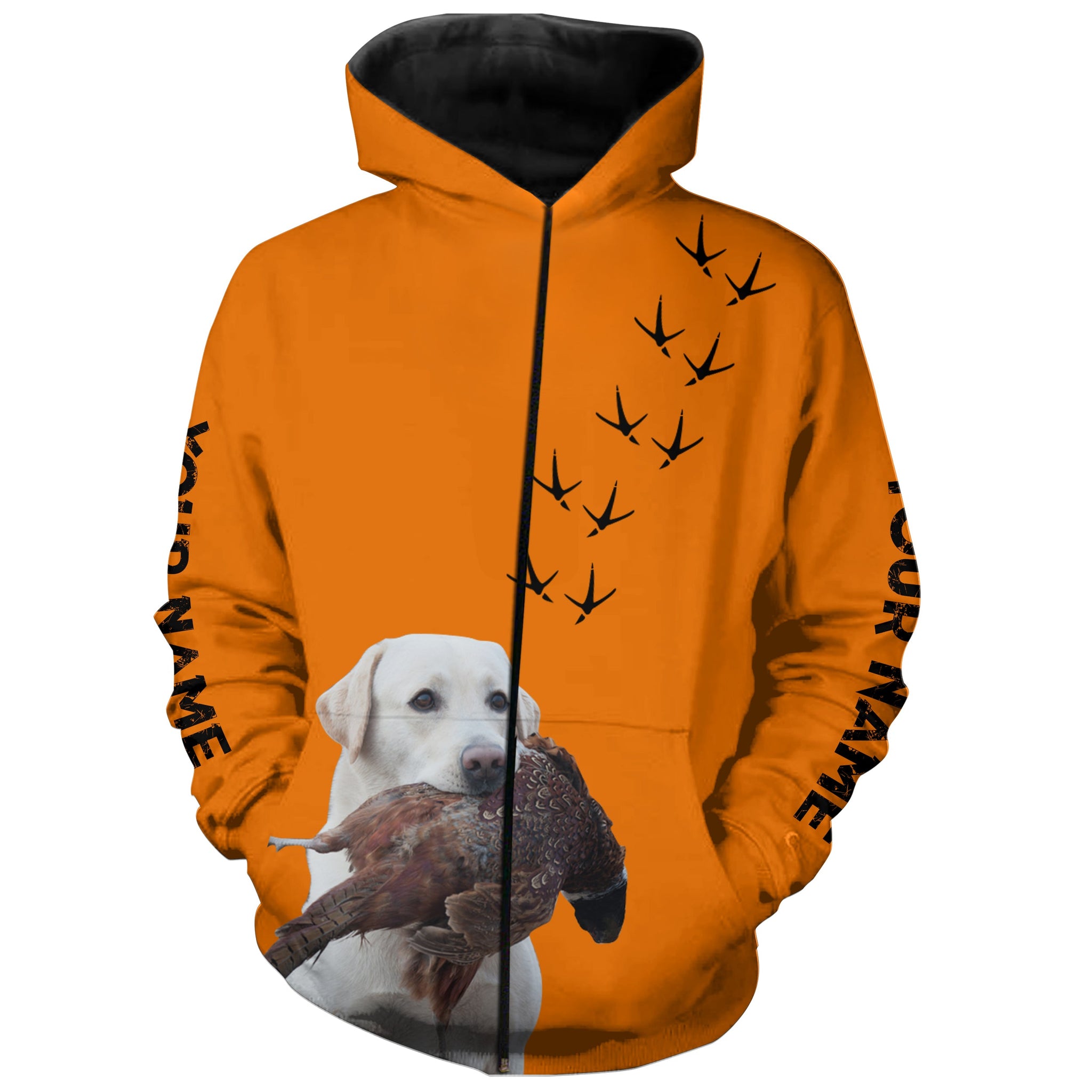 White Labs Dog Pheasant Hunting Blaze Orange custom Name Hunting Hoodie, T-shirt FSD3971
