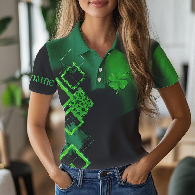 Womens golf polo shirts custom name green clover St Patrick day golf shirts, golfing gifts | Black NQS9514